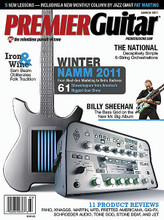Premier Guitar March 2011: Dying to find out what new gear will be available at your favorite guitar shop in the next few months? Our mammoth Winter NAMM 2011 wrap-up takes you to the country's biggest gear show with pics of the scenery and write-ups on 68 guitar and bass products that caught our eyes and ears. We also debut our new monthly lesson from jazz giant Pat Martino and talk to bass god Billy Sheehan and shredmeister Paul Gilbert on the new Mr. Big album, Bryce and Aaron Dessner on the National's acclaimed High Violet LP, and Sam Beam about his folk experimentalism on Iron and Wine's new release. Our reviews this month include gear from Fano * Knaggs * JET * Fretted Americana * Martin * Schroeder Amplification * Stone Deaf * Tone God * Gig-Fx * and MTD.